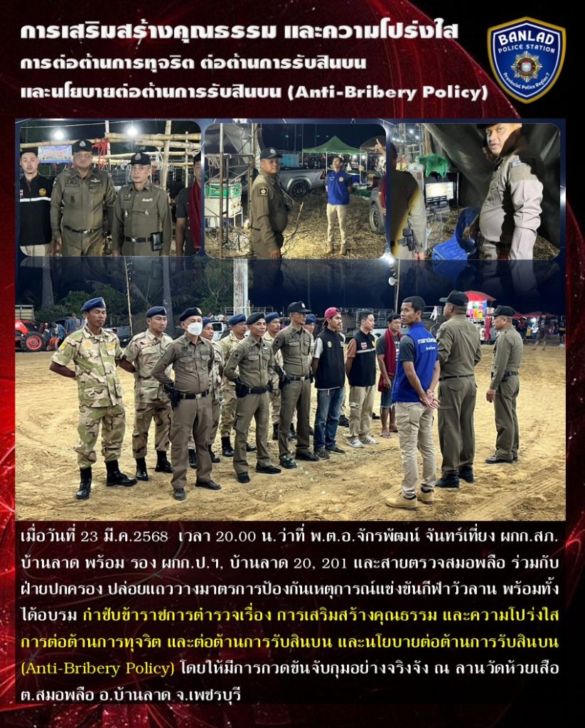 เมื่อวันที่ 23 มี.ค.2568  เวลา 20.00 น.ว่าที่ พ.ต.อ.จักรพัฒน์ จันทร์เที่ยง ผกก.สภ.บ้านลาด พร้อม รอง ผกก.ป.ฯ, บ้านลาด 20, 201 และสายตรวจสมอพลือ ร่วมกับฝ่ายปกครอง ปล่อยแถววางมาตรการป้องกันเหตุการณ์แข่งขันกีฬาวัวลาน พร้อมทั้ง ได้อบรม กำชับข้าราชการตำรวจเรื่อง การเสริมสร้างคุณธรรม และความโปร่งใส การต่อต้านการทุจริต และต่อต้านการรับสินบน และนโยบายต่อต้านการรับสินบน (Anti-Bribery Policy) โดยให้มีการกวดขันจับกุมอย่างจริงจัง ณ ลานวัดห้วยเสือ ต.สมอพลือ อ.บ้านลาด จ.เพชรบุรี
