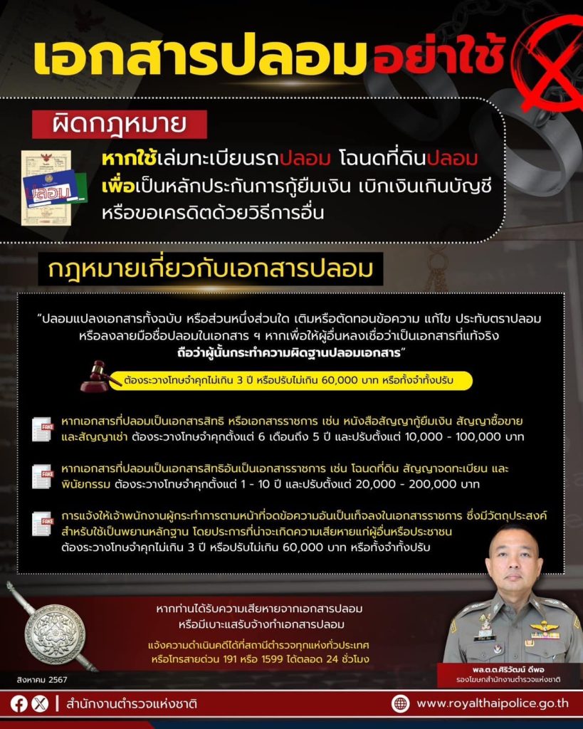 สำนักงานตำรวจแห่งชาติเตือนการใช้เล่มทะเบียนรถปลอม หรือโฉนดที่ดินปลอม มาใช้เป็นหลักประกันการให้กู้ยืมเงิน มีโทษตามกฎหมายอาญา จำคุกสูงสุด 10 ปี ปรับสูงสุด 200,000 บาท