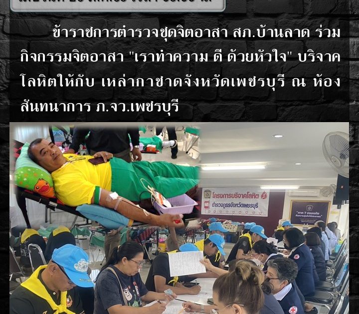 ข้าราชการตำรวจชุดจิตอาสา สภ.บ้านลาด ร่วมกิจกรรมจิตอาสา “เราทำความ ดี ด้วยหัวใจ” บริจาคโลหิตให้กับ เหล่ากาชาดจังหวัดเพชรบุรี เมื่อวันที่ 26 ม.ค.69 เวลา 09.00 น.
