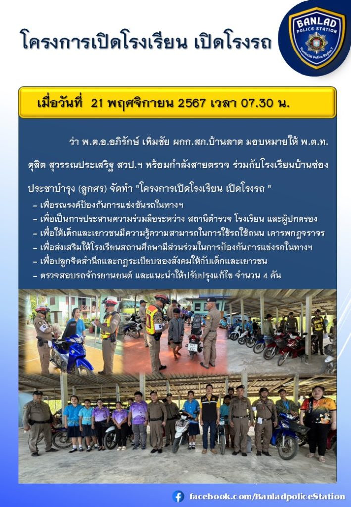 เมื่อวันที่ 21 พ.ย.67 เวลา 07.30 น. พ.ต.อ.อภิรักษ์ เพิ่มชัยผกก.สภ.บ้านลาด มอบหมายให้ พ.ต.ท.ดุสิต สุวรรณประเสริฐ สวป.สภ.บ้านลาด ร.ต.อ. รัชชานนท์รักษาราษฎร์ รอง สวป.ฯ พร้อมกำลัง สายตรวจรถยนต์ รถจักรยานยนต์ สายตรวจจราจร ร่วมกับ โรงเรียนบ้านซองประชาบำรุง จัดทำ “โครงการเปิดโรงเรียน เปิดโรงรถ ” ที่โรงเรียนบ้านซองประชาบำรุง
