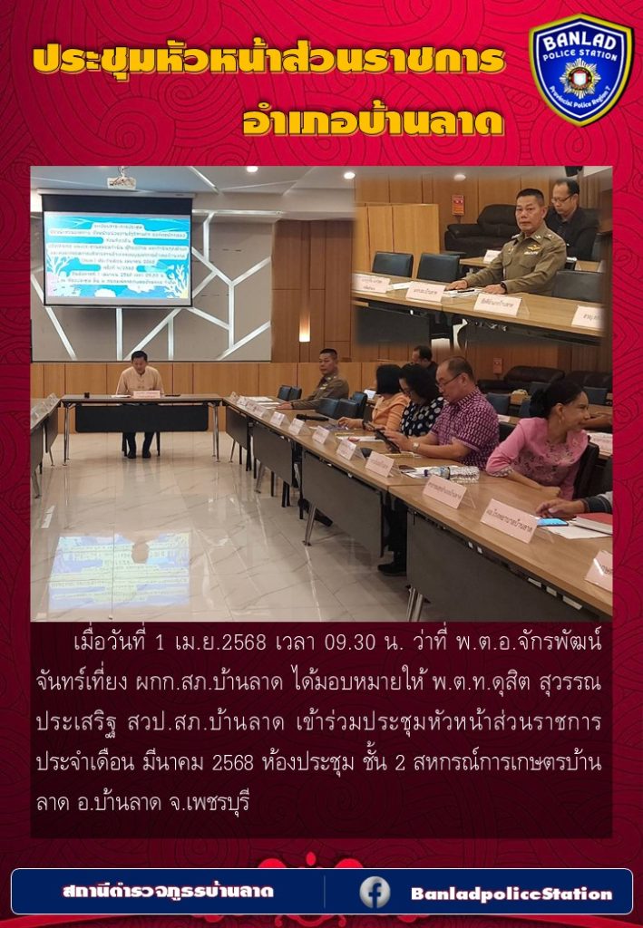 เมื่อวันที่ 1 เม.ย.2568 เวลา 09.30 น. ว่าที่ พ.ต.อ.จักรพัฒน์ จันทร์เที่ยง ผกก.สภ.บ้านลาด ได้มอบหมายให้ พ.ต.ท.ดุสิต สุวรรณประเสริฐ สวป.สภ.บ้านลาด เข้าร่วมประชุมหัวหน้าส่วนราชการ ประจำเดือน มีนาคม 2568 ห้องประชุม ชั้น 2 สหกรณ์การเกษตรบ้านลาด อ.บ้านลาด จ.เพชรบุรี