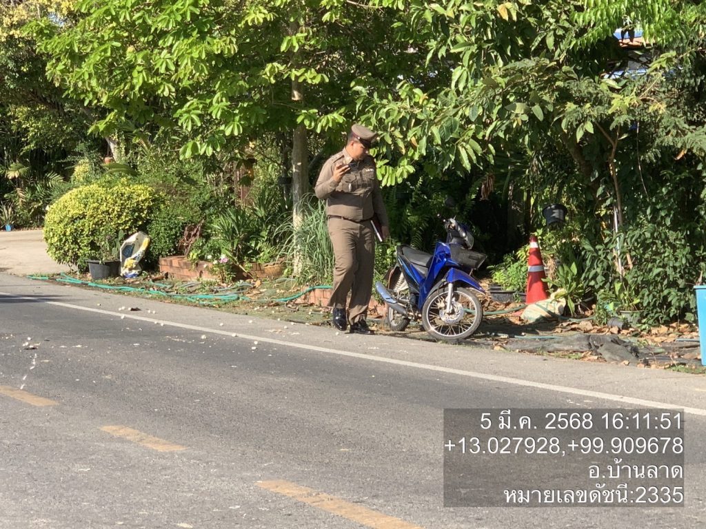 วันที่ 5 มี.ค.68 เวลา 16.11 น. ร.ต.อ.ณัฐธัญ พูลศรีสังข์ รอง สว.(สอบสวน).สภ.บ้านลาด พนักงานสอบสวนเวร ออกตรวจอุบัติเหตุจราจร ในพื้นที่ ตำบล ถ้ำรงค์ อ.บ้านลาด จ.เพชรบุรี