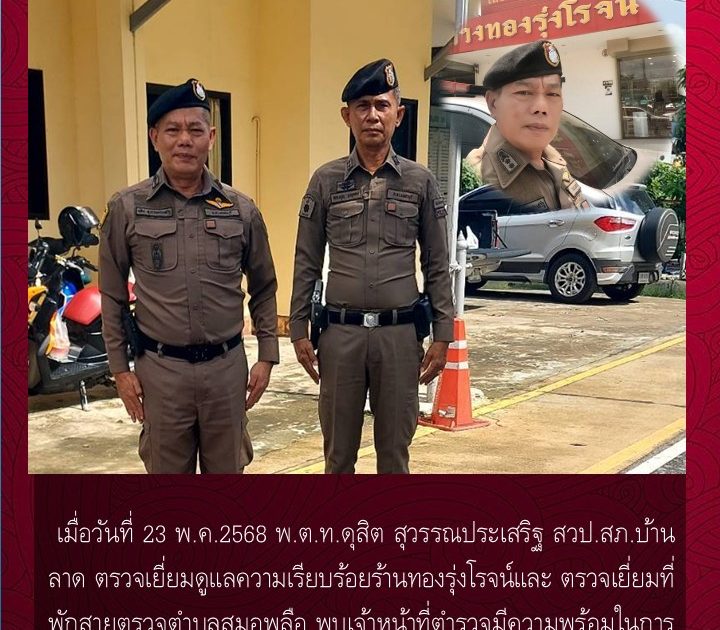พ.ต.ท.ดุสิต สุวรรณประเสริฐ สวป.สภ.บ้านลาด ตรวจเยี่ยมดูแลความเรียบร้อยร้านทองรุ่งโรจน์และ ตรวจเยี่ยมที่พักสายตรวจสมอพลือ เมื่อวันที่ 23 พ.ค.2568