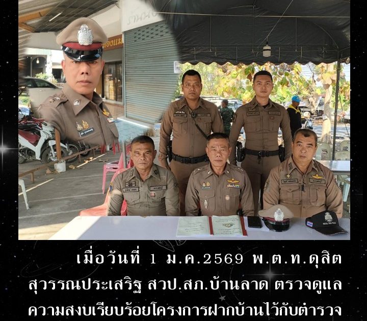 พ.ต.ท.ดุสิต สุวรรณประเสริฐ สวป.สภ.บ้านลาด ตรวจดูแลความสงบเรียบร้อยโครงการฝากบ้านไว้กับตำรวจ ศรีสวัสดิ์ และตรวจจุดบริการประชาชน เมื่อวันที่ 1 ม.ค.2569