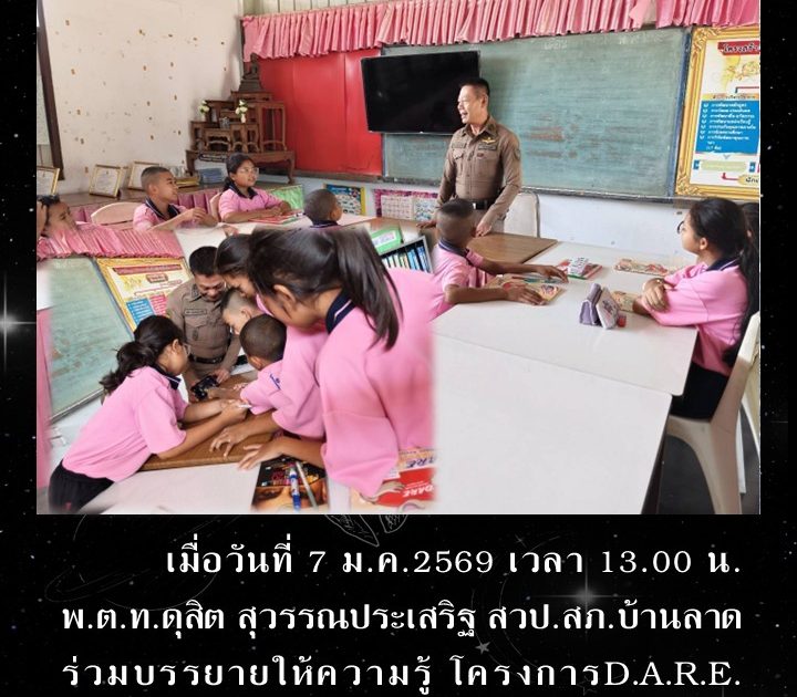พ.ต.ท.ดุสิต สุวรรณประเสริฐ สวป.สภ.บ้านลาด ร่วมบรรยายให้ความรู้ โครงการD.A.R.E. โรงเรียนบ้านไร่ถิ่นน้อย เมื่อวันที่ 7 ม.ค.2569 เวลา 13.00 น.