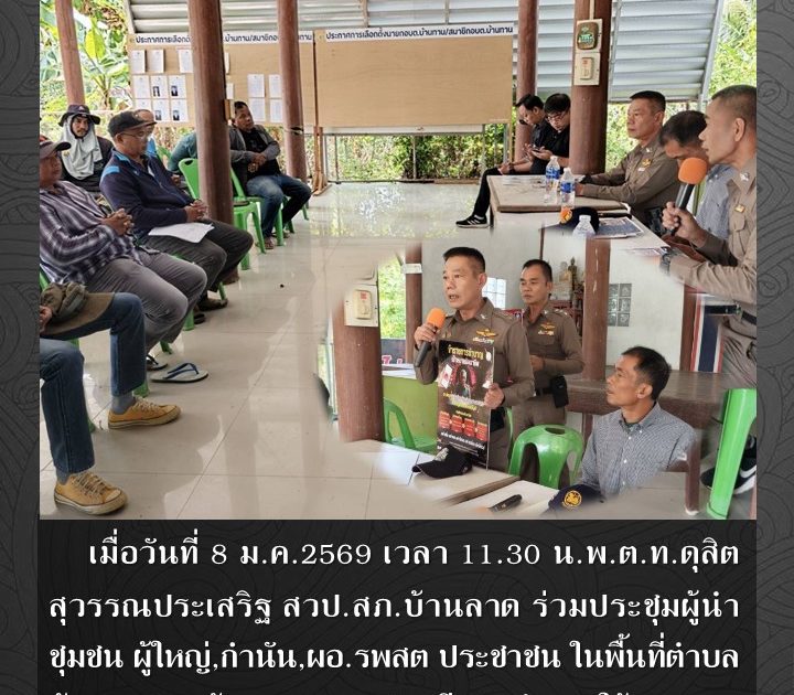 พ.ต.ท.ดุสิต สุวรรณประเสริฐ สวป.สภ.บ้านลาด ร่วมประชุมผู้นำชุมชน ผู้ใหญ่,กำนัน,ผอ.รพสต ประชาชน ในพื้นที่ตำบลบ้านทาน อ.บ้านลาด เมื่อวันที่ 8 ม.ค.2569 เวลา 11.30 น.