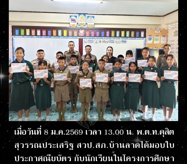 พ.ต.ท.ดุสิต สุวรรณประเสริฐ สวป.สภ.บ้านลาดได้มอบใบประกาศณียบัตร กับนักเรียนในโครงการศึกษาเพื่อต่อต้านการใช้ยาเสพติด เมื่อวันที่ 8 ม.ค.2569 เวลา 13.00 น.
