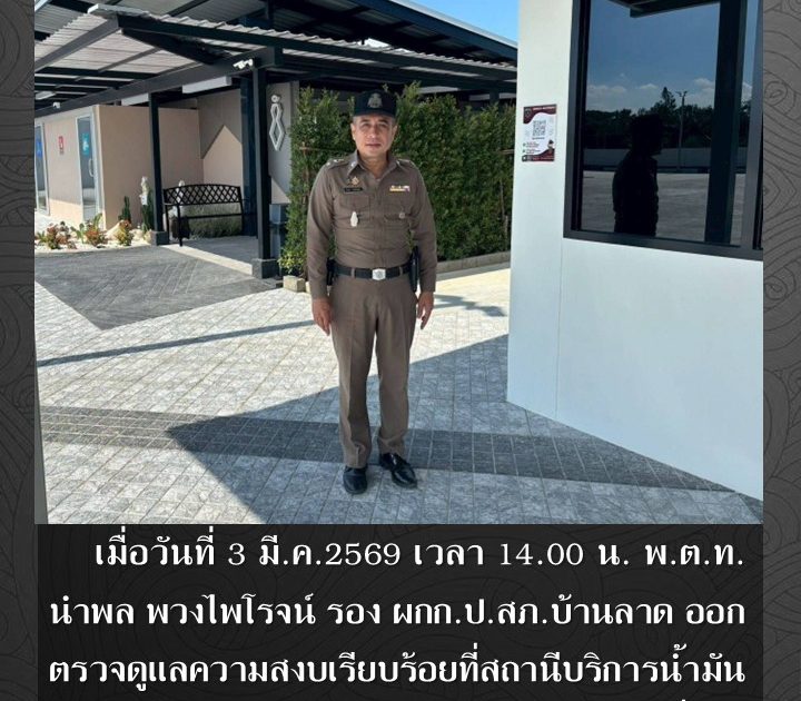 พ.ต.ท.นำพล พวงไพโรจน์ รอง ผกก.ป.สภ.บ้านลาด ออกตรวจดูแลความสงบเรียบร้อย เมื่อวันที่ 3 มี.ค.2569 เวลา 14.00 น.