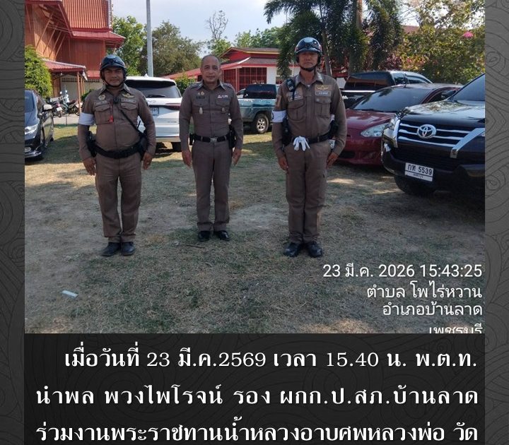 พ.ต.ท.นำพล พวงไพโรจน์ รอง ผกก.ป.สภ.บ้านลาด ร่วมงานพระราชทานน้ำหลวงอาบศพหลวงพ่อ วัดห้วยเสือ เมื่อวันที่ 23 มี.ค.2569 เวลา 15.40 น.