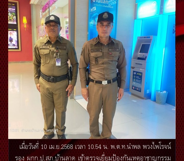 พ.ต.ท.นำพล พวงไพโรจน์ รอง ผกก.ป.สภ.บ้านลาด เข้าตรวจเยี่ยมป้องกันเหตุอาชาญกรรม ดูแลความเรียบร้อยที่ธนาคาร เมื่อวันที่ 10 เม.ย.2568 เวลา 10.54 น.