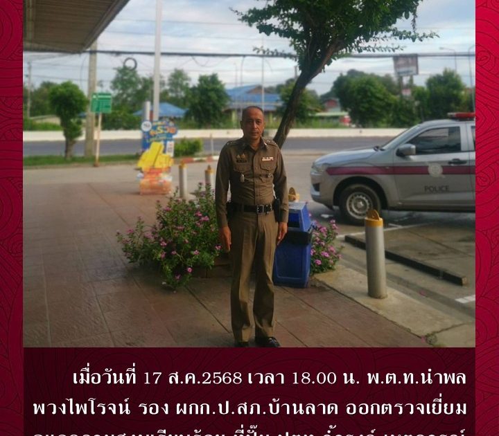 พ.ต.ท.นำพล พวงไพโรจน์ รอง ผกก.ป.สภ.บ้านลาด ออกตรวจเยี่ยมดูแลความสงบเรียบร้อย ที่ปั๊ม ปตท.ถ้ำรงค์ เมื่อวันที่ 17 ส.ค.2568 เวลา 18.00 น.
