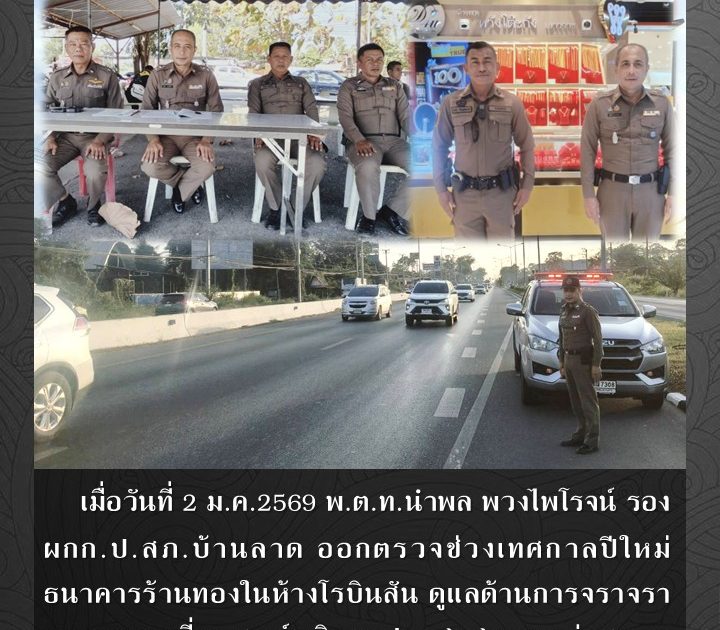 พ.ต.ท.นำพล พวงไพโรจน์ รอง ผกก.ป.สภ.บ้านลาด ออกตรวจช่วงเทศกาลปีใหม่ ธนาคารร้านทองในห้างโรบินสัน ดูแลด้านการจราจรา และตรวจเยี่ยมศูนย์บริการประชาชน เมื่อวันที่ 2 ม.ค.2569