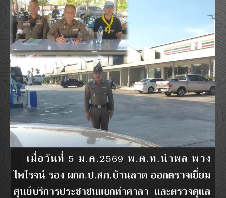 พ.ต.ท.นำพล พวงไพโรจน์ รอง ผกก.ป.สภ.บ้านลาด ออกตรวจเยี่ยมศูนย์บริการประชาชนแยกท่าศาลา และตรวจดูแลความสงบเรียบร้อย เมื่อวันที่ 5 ม.ค.2569