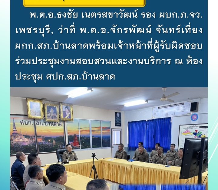 พ.ต.อ.ธงชัย เนตรสขาวัฒน์ รอง ผบก.ภ.จว.เพชรบุรี, ว่าที่ พ.ต.อ.จักรพัฒน์ จันทร์เที่ยง ผกก.สภ.บ้านลาดพร้อมเจ้าหน้าที่ผู้รับผิดชอบ ร่วมประชุมงานสอบสวนและงานบริการ เมื่อวันที่ 1 ตุลาคม 2568 เวลา 11.20 น.