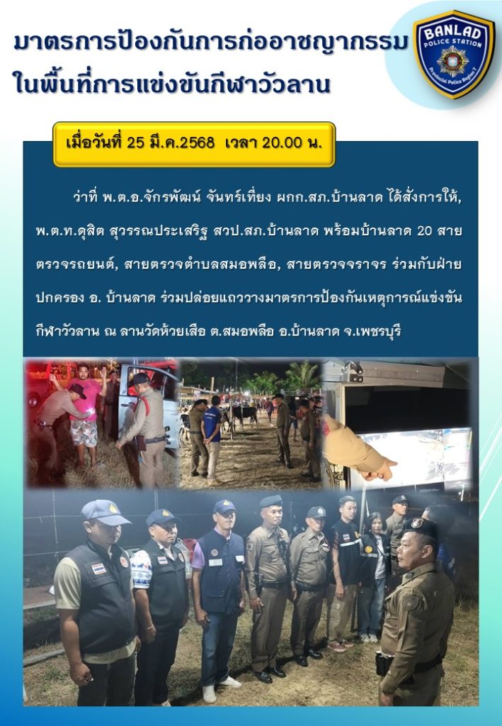 เมื่อ 25 มีนาคม 2568 เวลา 20.00 น.ภายใต้การอำนวยการของ ว่าที่ พ.ต.อ.จักรพัฒน์ จันทร์เที่ยง ผกก.สภ.บ้านลาด สั่งการให้ พ.ต.ท.ดุสิต สุวรรณประเสริฐ สวป.สภ. บ้านลาด, ร.ต.อ.รัชชานนท์ รักษาราษฎร์ รอง สวป.สภ.บ้านลาด (ร้อยเวร20),202 สายตรวจรถยนต์และสายตรวจตำบลสมอพลือ สายตรวจจราจร ร่วมกับฝ่ายปกครอง อ. บ้านลาด โดย