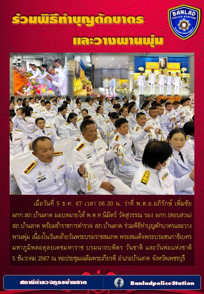 เมื่อวันที่ 5 ธ.ค. 67 เวลา 06.30 น. พ.ต.อ.อภิรักษ์ เพิ่มชัย ผกก.สภ.บ้านลาด ได้มอบหมายให้ พ.ต.ท.นิมิตร์ วัดสุวรรณ รอง ผกก.(สอบสวน)สภ.บ้านลาด พร้อมข้าราชการตำรวจ สภ.บ้านลาด รวม 10 นาย ร่วมพิธีทำบุญตักบาตรและวางพานพุ่ม เนื่องในวันคล้ายวันพระบรมราชสมภพ พระสมเด็จพระบรมชนกาธิเบศร มหาภูมิพลอดุลยเดชมหาราช บรมนาถบพิตร วันชาติ และวันพ่อแห่งชาติ 5 ธันวาคม 2567 ณ หอประชุมเฉลิมพระเกียรติ อำเภอบ้านลาด จังหวัดเพชรบุรี