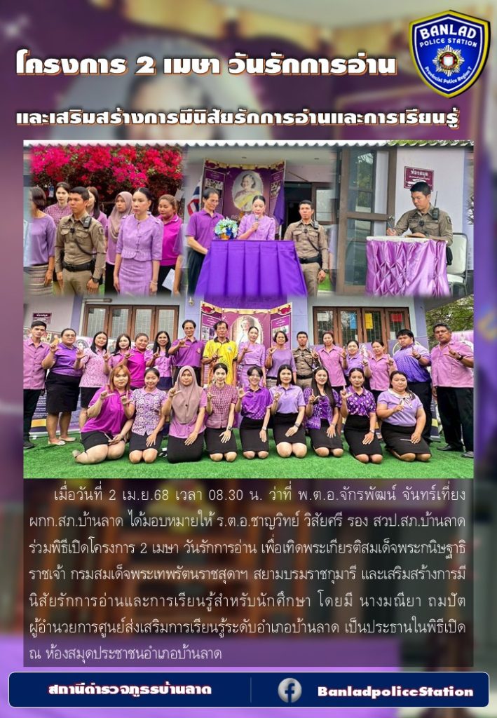 เมื่อวันที่ 2 เม.ย.68 เวลา 08.30 น. ว่าที่ พ.ต.อ.จักรพัฒน์ จันทร์เที่ยง ผกก.สภ.บ้านลาด ได้มอบหมายให้ ร.ต.อ.ชาญวิทย์ วิสัยศรี รอง สวป.สภ.บ้านลาด ร่วมพิธีเปิดโครงการ 2 เมษา วันรักการอ่าน เพื่อเทิดพระเกียรติสมเด็จพระกนิษฐาธิราชเจ้า กรมสมเด็จพระเทพรัตนราชสุดาฯ สยามบรมราชกุมารี และเสริมสร้างการมีนิสัยรักการอ่านและการเรียนรู้สำหรับนักศึกษา โดยมี นางมณียา ถมปัต ผู้อำนวยการศูนย์ส่งเสริมการเรียนรู้ระดับอำเภอบ้านลาด เป็นประธานในพิธีเปิด  ณ ห้องสมุดประชาชนอำเภอบ้านลาด