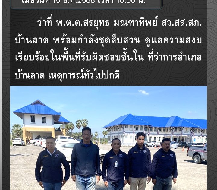 ว่าที่ พ.ต.ต.สรยุทธ มณฑาทิพย์ สว.สส.สภ.บ้านลาด ดูแลความสงบเรียบร้อยในพื้นที่รับผิดชอบ เมื่อวันที่ 15 ธ.ค.2568 เวลา 16.00 น.