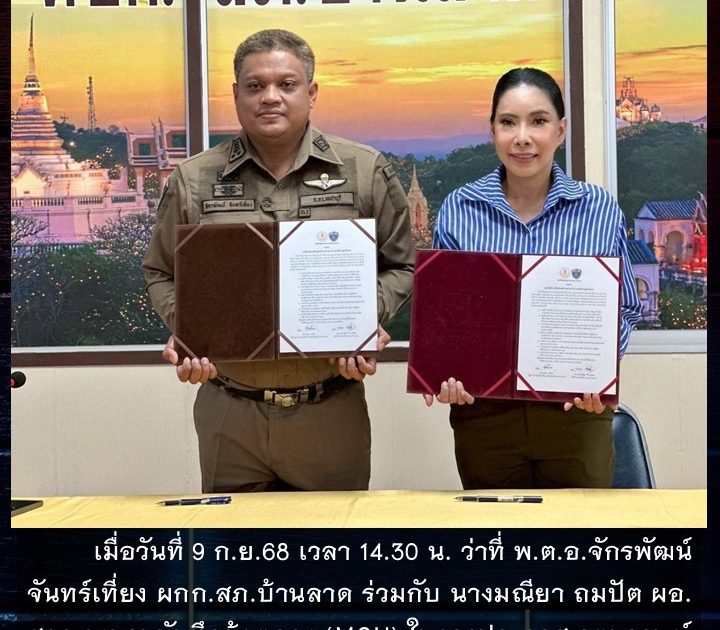 ว่าที่ พ.ต.อ.จักรพัฒน์ จันทร์เที่ยง ผกก.สภ.บ้านลาด ร่วมกับ นางมณียา ถมปัต ผอ.สกร ลงนามบันทึกข้อตกลง (MOU) ในการประกาศเจตนารมณ์ เพื่อส่งเสริม สร้างความสัมพันธ์ในการทำงานฯ เมื่อวันที่ 9 ก.ย.68 เวลา 14.30 น.