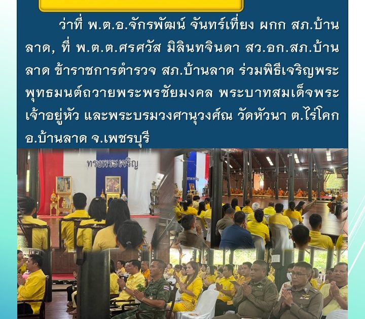 ว่าที่ พ.ต.อ.จักรพัฒน์ จันทร์เที่ยง ผกก สภ.บ้านลาด, ที่ พ.ต.ต.ศรศวัส มิลินทจินดา สว.อก.สภ.บ้านลาด ข้าราชการตำรวจ สภ.บ้านลาด ร่วมพิธีเจริญพระพุทธมนต์ถวายพระพรชัยมงคล เมื่อวันที่ 26 ก.ย.2568 เวลา 15.00 น.