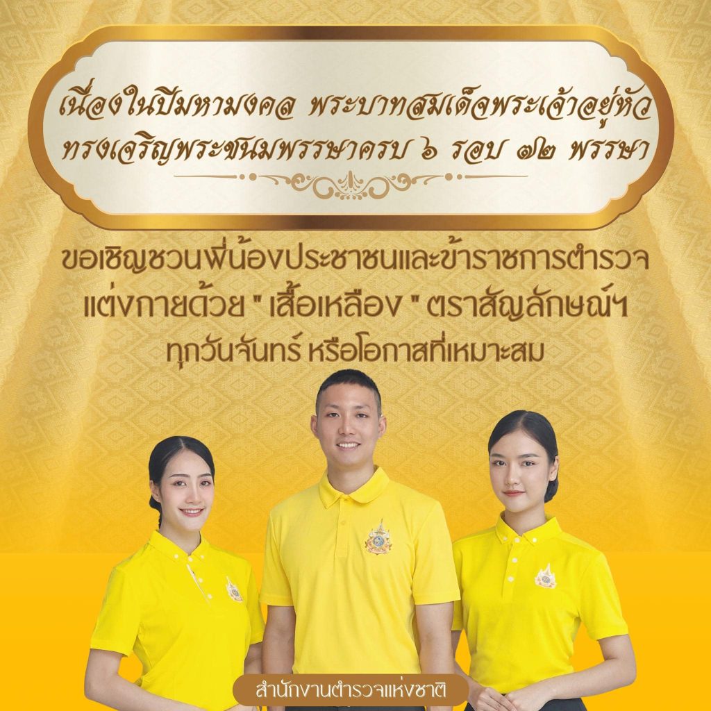 ขอเชิญชวนพี่น้องประชาชน และข้าราชการตำรวจ แต่งกายด้วยเสื้อเหลือง ตราสัญลักษณ์ ฯ ทุกวันจันทร์ หรือโอกาสที่เหมาะสม เพื่อร่วมแสดงความจงรักภักดี และสำนึกในพระมหากรุณาธิคุณ