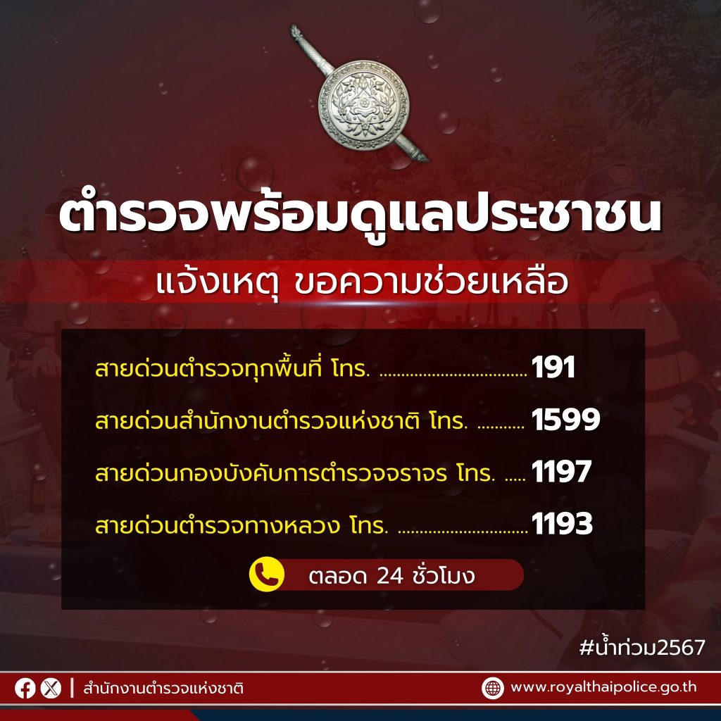 สำนักงานตำรวจแห่งชาติ ห่วงใยพี่น้องประชาชนในพื้นที่ประสบอุทกภัย โดยเปิดสายด่วนให้ความช่วยเหลือประชาชน