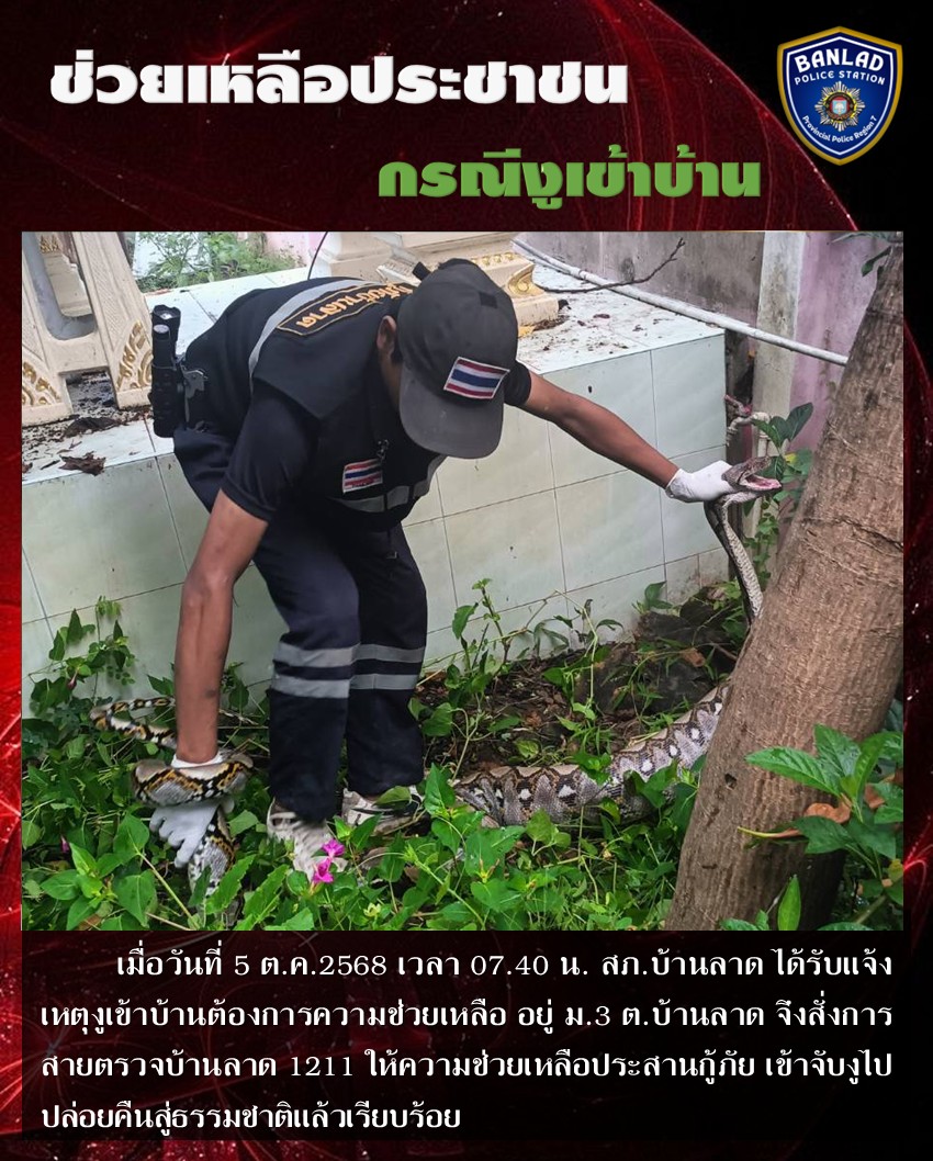 สายตรวจบ้านลาด 1211 ให้ความช่วยเหลือประชาชน กรณีงูเข้าบ้าน เมื่อวันที่ 5 ต.ค.2568 เวลา 07.40 น. 10 ตุลาคม 2568 โดย ณัฐวุฒิ เมืองขวัญใจ