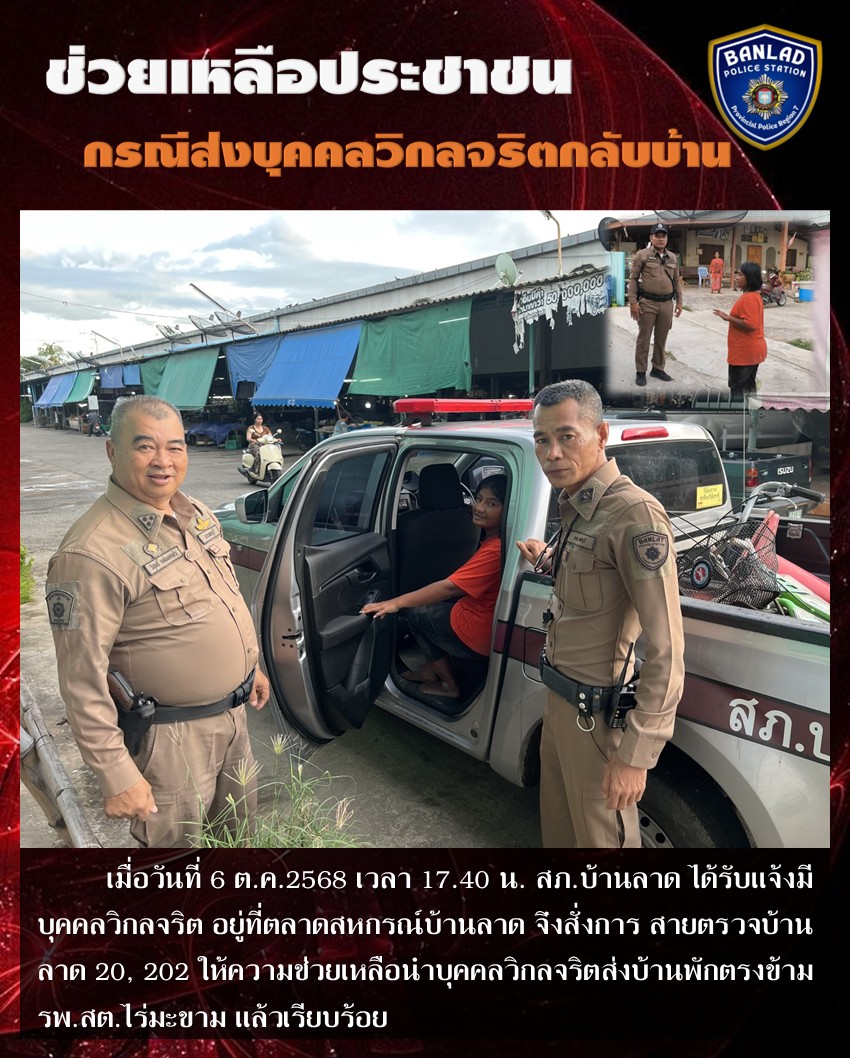 สายตรวจบ้านลาด 20, 202 ให้ความช่วยเหลือนำบุคคลวิกลจริตส่งบ้านพัก เมื่อวันที่ 6 ต.ค.2568 เวลา 17.40 น. 10 ตุลาคม 2568 โดย ณัฐวุฒิ เมืองขวัญใจ