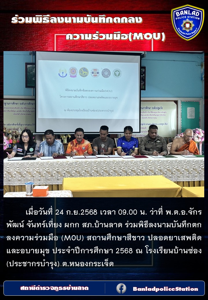 ว่าที่ พ.ต.อ.จักรพัฒน์ จันทร์เที่ยง ผกก สภ.บ้านลาด ร่วมพิธีลงนามบันทึกตกลงความร่วมมือ (MOU) สถานศึกษาสีขาว เมื่อวันที่ 24 ก.ย.2568 เวลา 09.00 น. 30 กันยายน 2568 โดย ณัฐวุฒิ เมืองขวัญใจ