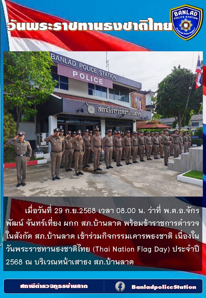 ว่าที่ พ.ต.อ.จักรพัฒน์ จันทร์เที่ยง ผกก สภ.บ้านลาด พร้อมข้าราชการตำรวจในสังกัด สภ.บ้านลาด เข้าร่วมกิจกรรมเคารพธงชาติ เนื่องในวันพระราชทานธงชาติไทย เมื่อวันที่ 29 ก.ย.2568 เวลา 08.00 น. 1 ตุลาคม 2568 โดย ณัฐวุฒิ เมืองขวัญใจ