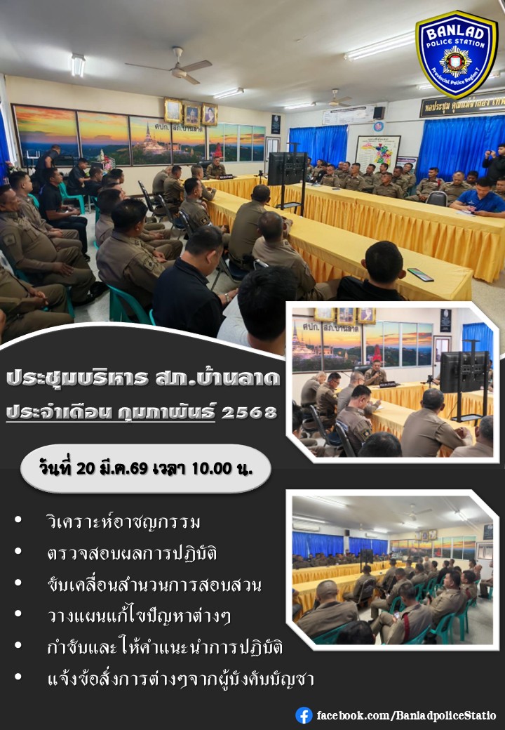 ประชุมบริหาร สภ.บ้านลาดประจำเดือน กุมภาพันธ์ 2568 เมื่อวันที่ 20 มี.ค.69 เวลา 10.00 น. 25 มีนาคม 2569 โดย ณัฐวุฒิ เมืองขวัญใจ