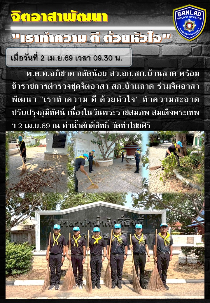 พ.ต.ท.อภิชาต กลัดน้อย สว.อก.สภ.บ้านลาด พร้อมข้าราชการตำรวจชุดจิตอาสา สภ.บ้านลาด ร่วมจิตอาสาพัฒนา “เราทำความ ดี ด้วยหัวใจ” เมื่อวันที่ 2 เม.ย.69 เวลา 09.30 น. 2 เมษายน 2569 โดย ณัฐวุฒิ เมืองขวัญใจ