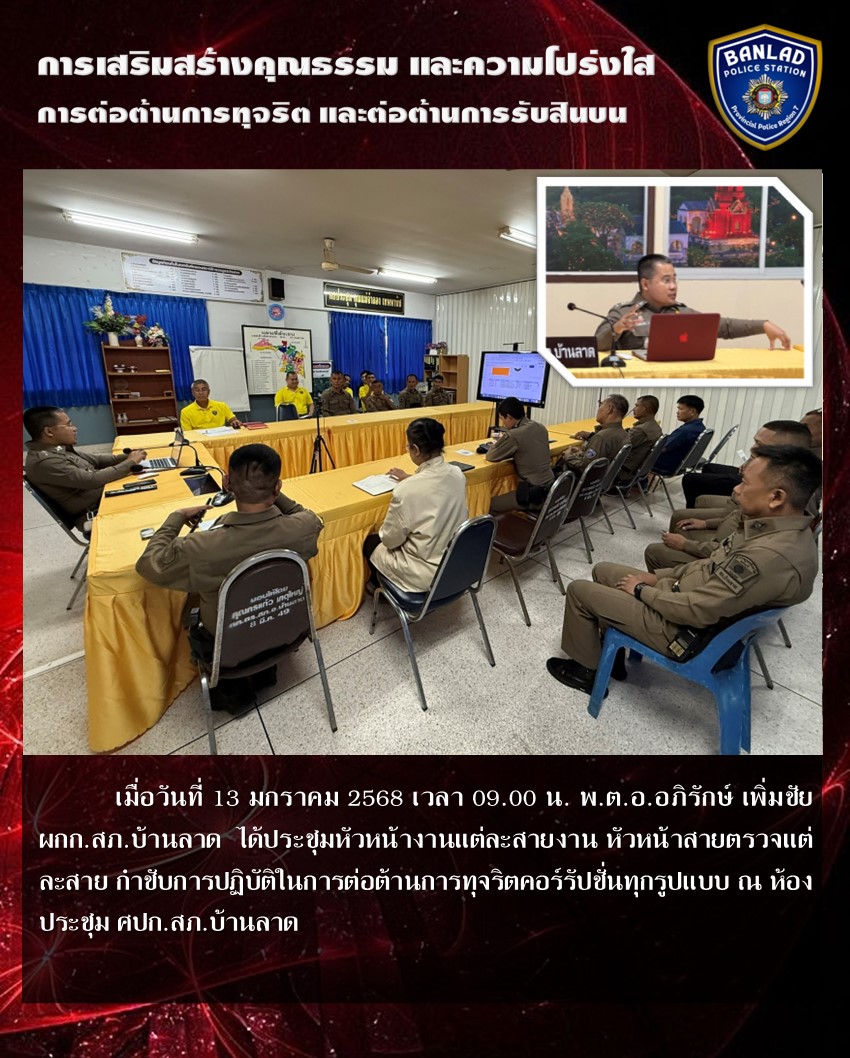 ประชุมกำชับและขับเคลื่อนการประเมินคุณธรรมและความโปร่งใสในการดำเนินงานภาครัฐ ( ITA ) ประจำปี 2568 ของ สถานีตำรวจภูธรบ้านลาด เมื่อวันที่ 11 เม.ย.2568 เวลา 14.00 น.