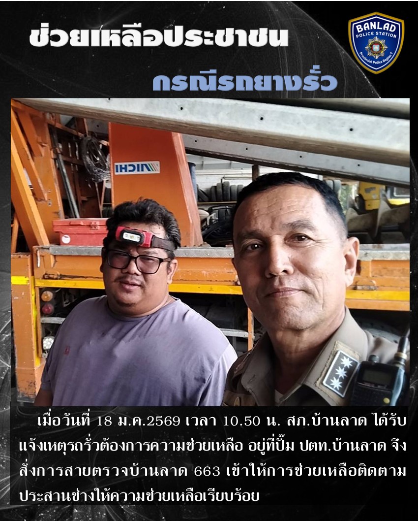 สายตรวจบ้านลาด 663ให้การช่วยเหลือประชาชนกรณีรถยางแตก เมื่อวันที่ 18 ม.ค.2569 เวลา 10.50 น. 21 มกราคม 2569 โดย ณัฐวุฒิ เมืองขวัญใจ