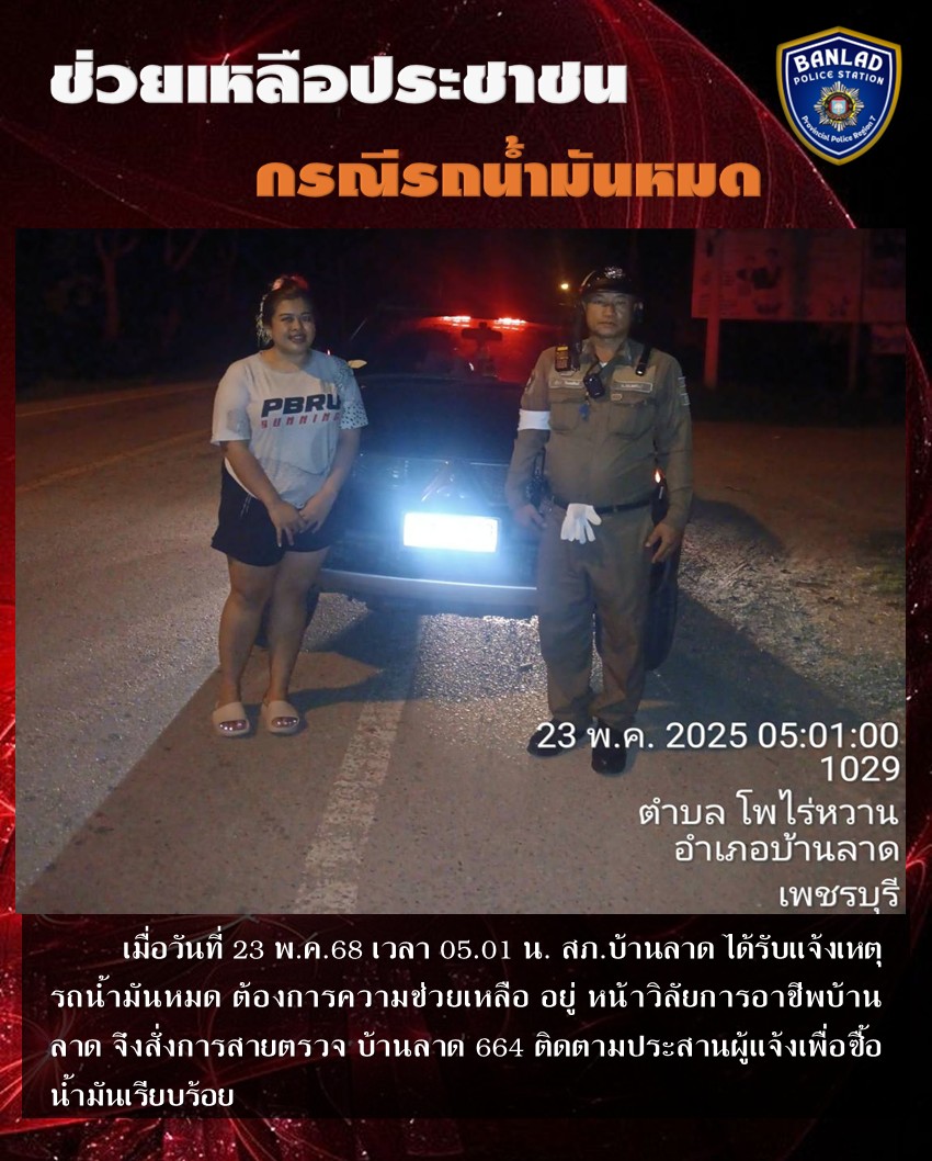 สายตรวจ บ้านลาด 664 ให้การช่วยเหลือประชาชนกรณีน้ำมันหมด เมื่อวันที่ 23 พ.ค.68 เวลา 05.01 น. 23 พฤษภาคม 2568 โดย ณัฐวุฒิ เมืองขวัญใจ