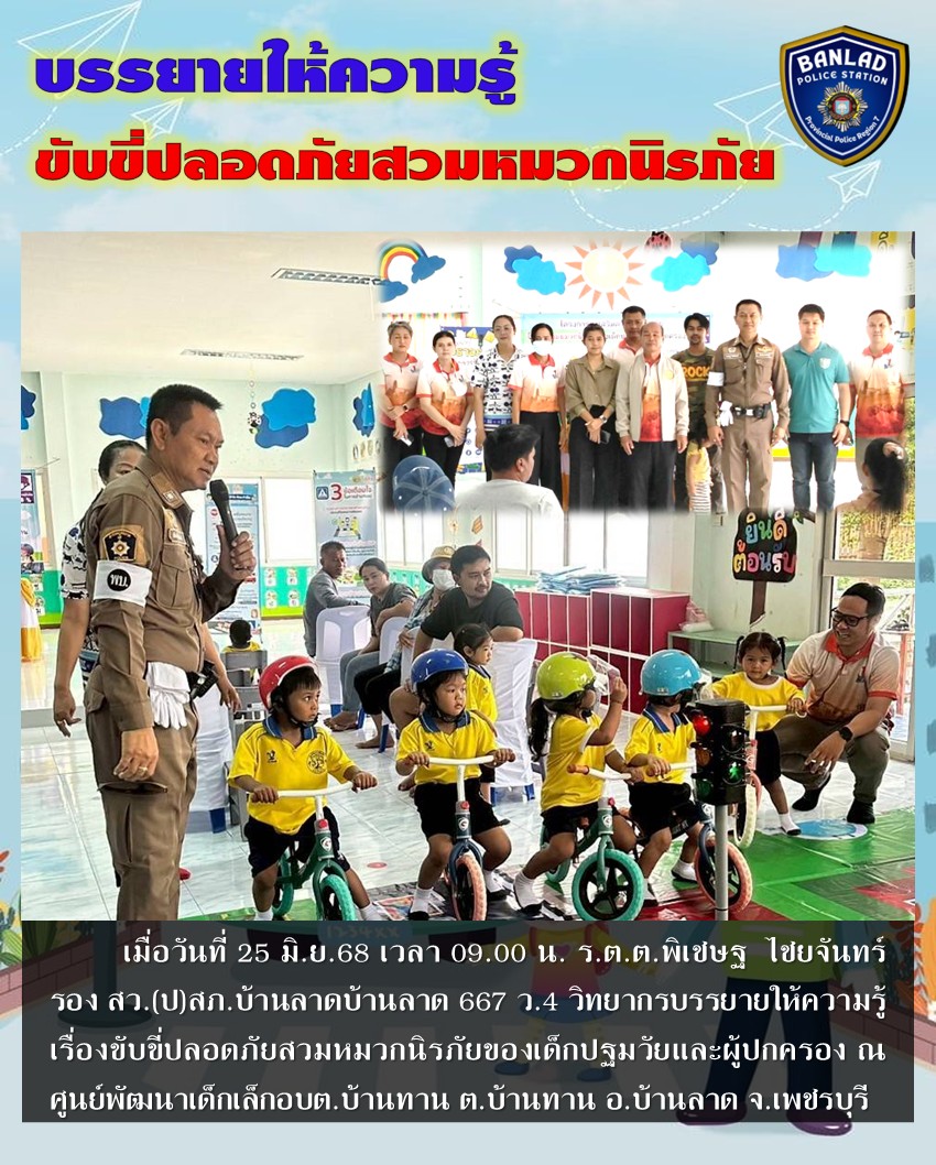 บรรยายให้ความรู้เรื่องขับขี่ปลอดภัยสวมหมวกนิรภัยของเด็กปฐมวัยและผู้ปกครอง เมื่อวันที่ 25 มิ.ย.68 เวลา 09.00 น. 27 มิถุนายน 2568 โดย ณัฐวุฒิ เมืองขวัญใจ