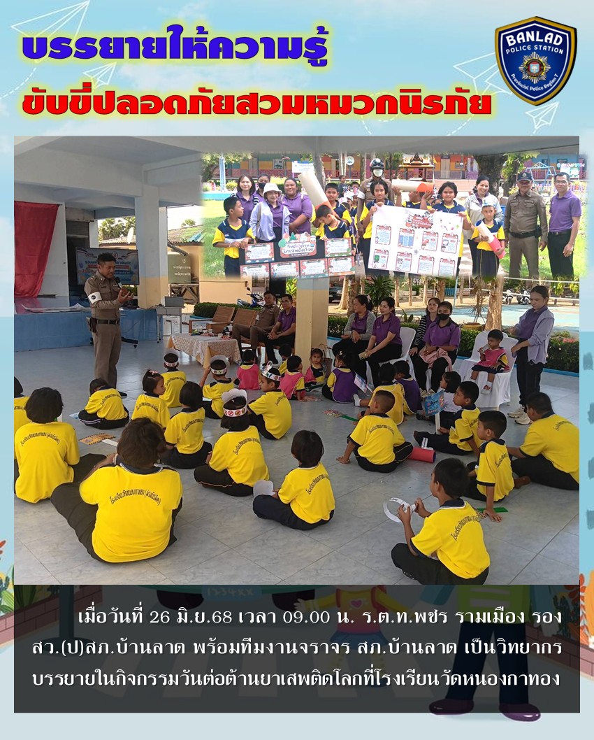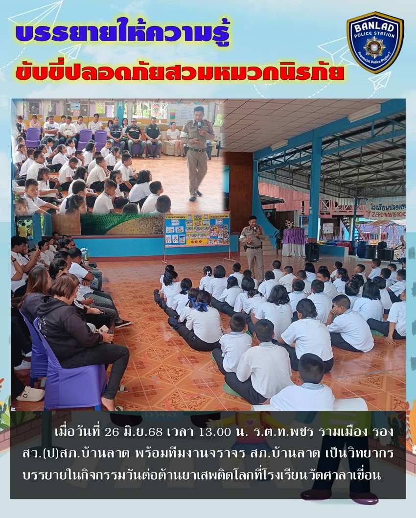 ร.ต.ท.พชร รามเมือง รอง สว.(ป)สภ.บ้านลาด พร้อมทีมงานจราจร เป็นวิทยากรบรรยายในกิจกรรมวันต่อต้านยาเสพติดโลกที่โรงเรียนวัดศาลาเขี่อน เมื่อวันที่ 26 มิ.ย.68 เวลา 13.00 น. 30 มิถุนายน 2568 โดย ณัฐวุฒิ เมืองขวัญใจ