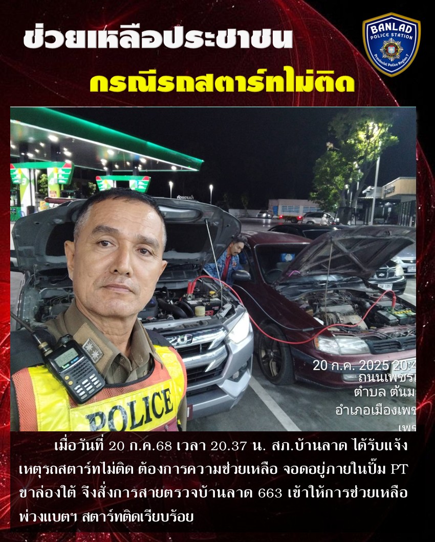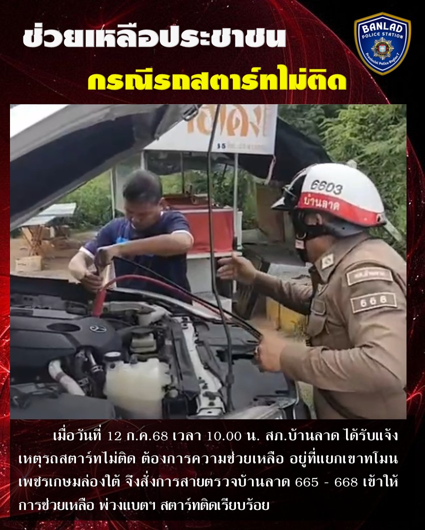 สายตรวจบ้านลาด 665 – 668 ให้การช่วยเหลือประชาชน กรณีรถสตาร์ทไม่ติด เมื่อวันที่ 12 ก.ค.68 เวลา 10.00 น. 15 กรกฎาคม 2568 โดย ณัฐวุฒิ เมืองขวัญใจ