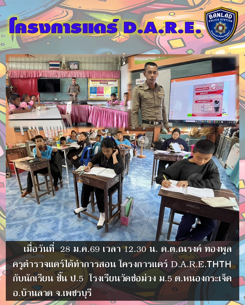 ด.ต.ณรงค์ ทองพูล ครูตำรวจแดร์ได้ทำการสอน โครงการแดร์ D.A.R.E.🇹🇭🇹🇭 กับนักเรียน ชั้น ป.5 โรงเรียนวัดช่อม่วง เมื่อวันที่ 28 ม.ค.69 เวลา 12.30 น. 30 มกราคม 2569 โดย ณัฐวุฒิ เมืองขวัญใจ