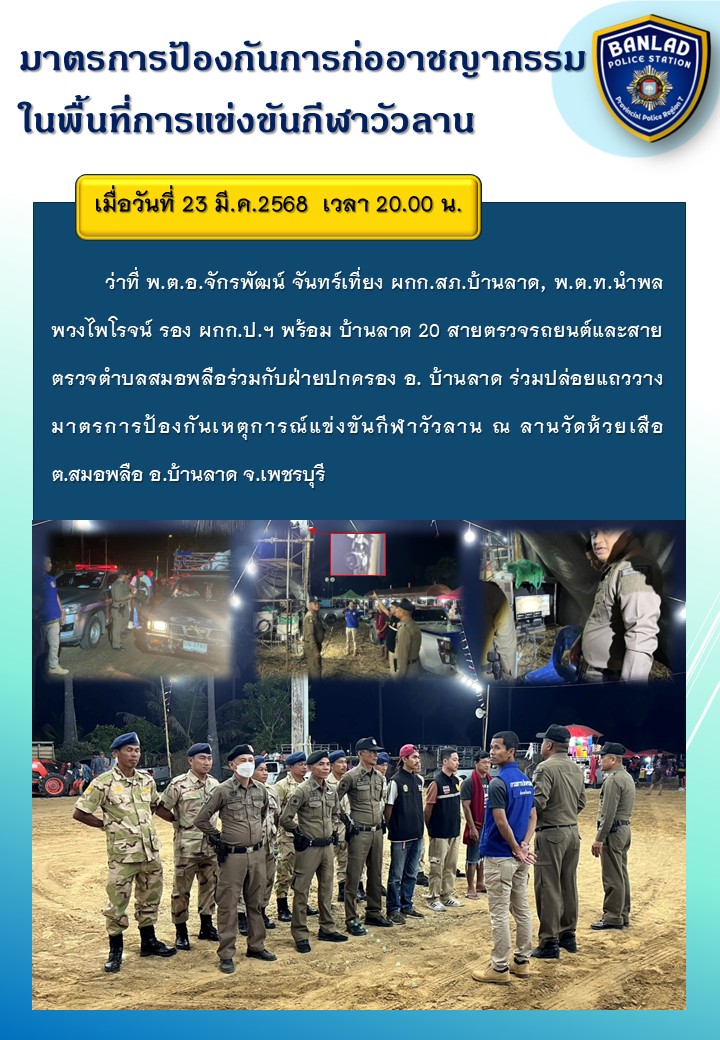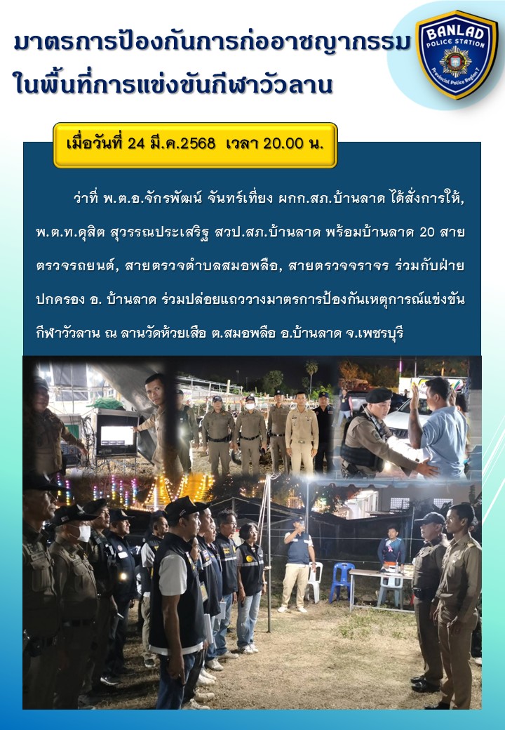 มาตรการป้องกันการก่ออาชญากรรม ในพื้นที่การแข่งขันกีฬาวัวลาน เมื่อวันที่ 24 มี.ค.2568 เวลา 20.00 น.
