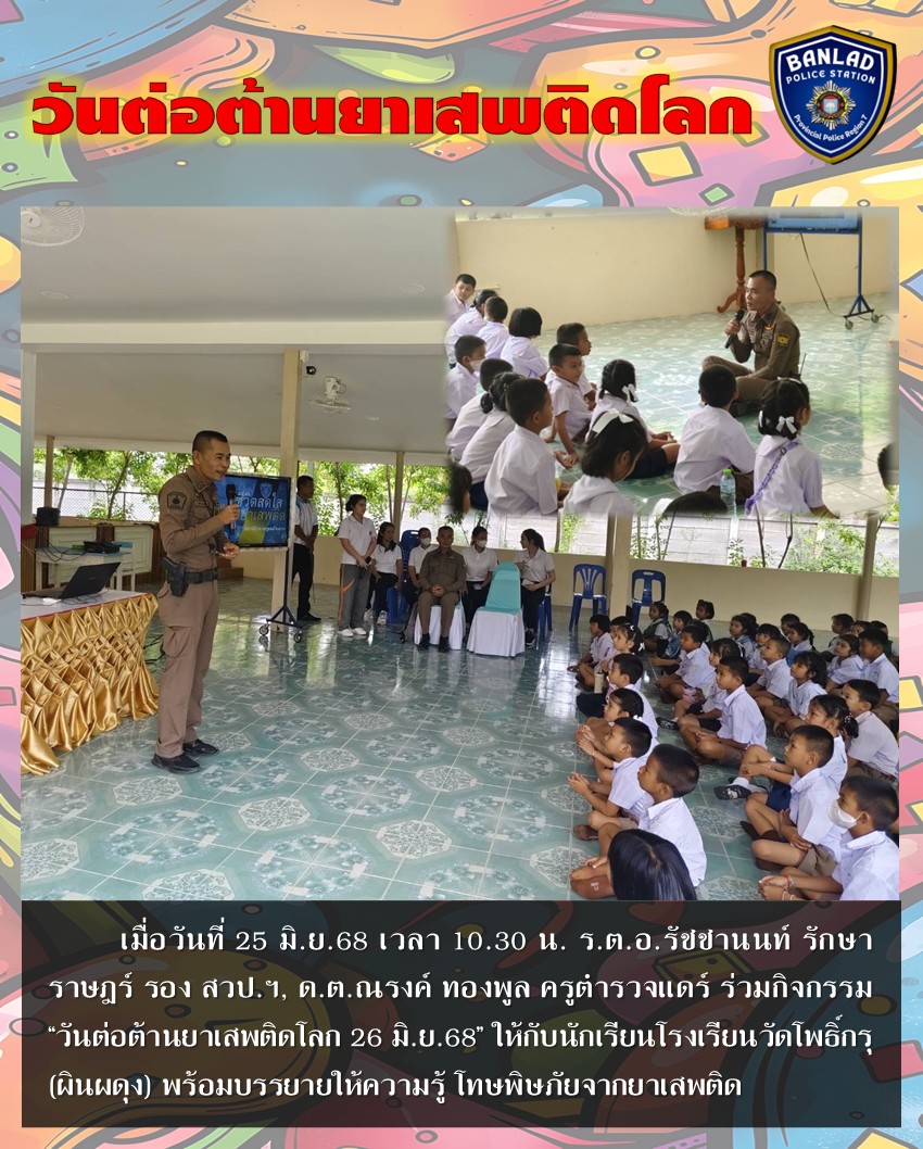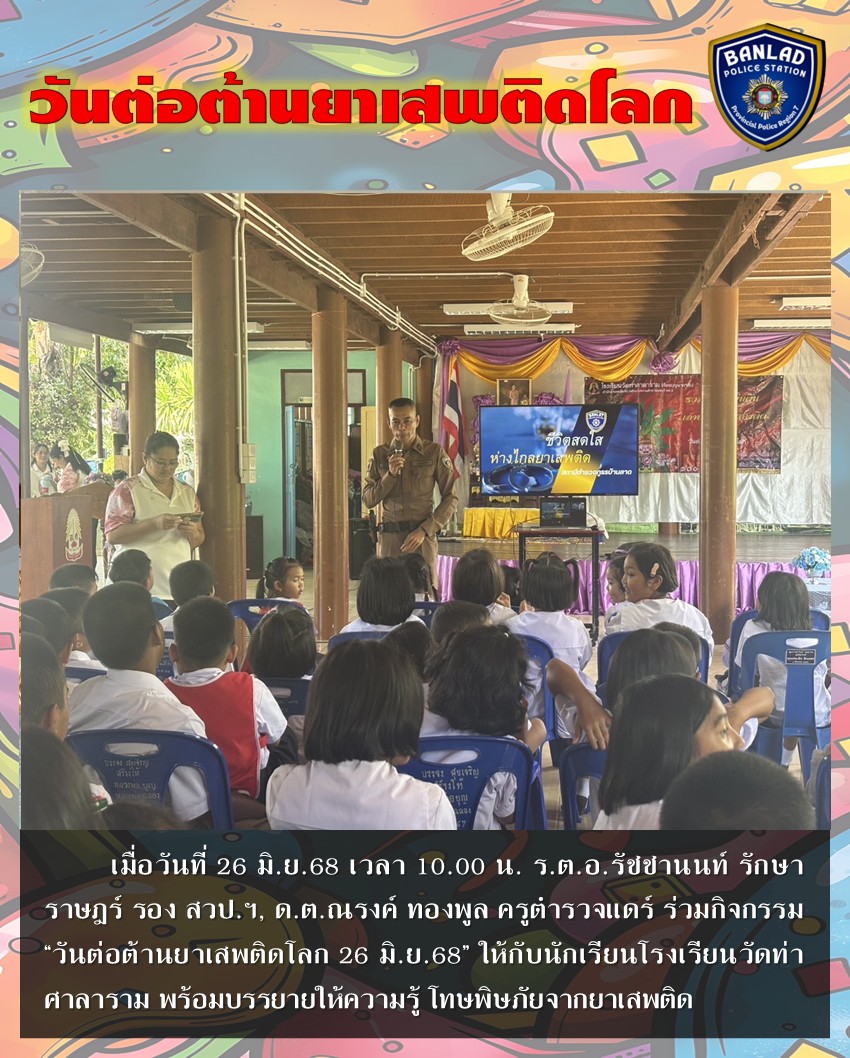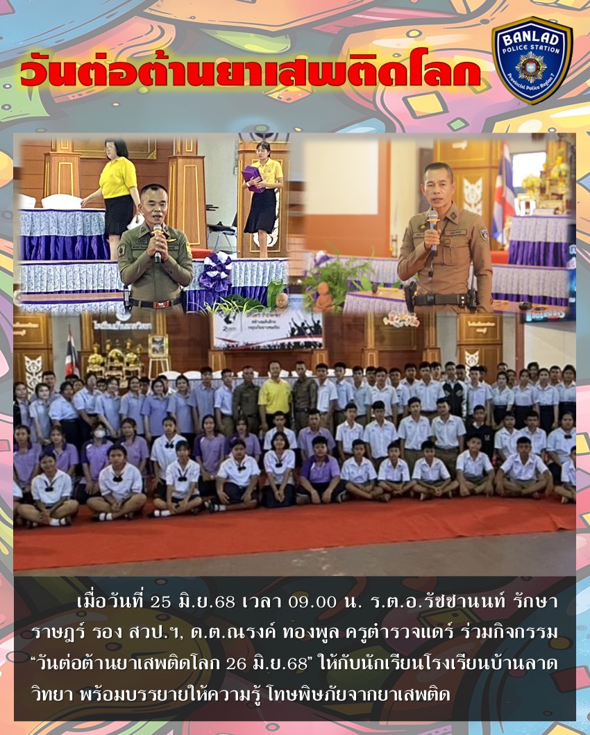 ร่วมกิจกรรม “วันต่อต้านยาเสพติดโลก 26 มิ.ย.68” โรงเรียนบ้านลาดวิทยา เมื่อวันที่ 25 มิ.ย.68 เวลา 09.00 น. 27 มิถุนายน 2568 โดย ณัฐวุฒิ เมืองขวัญใจ
