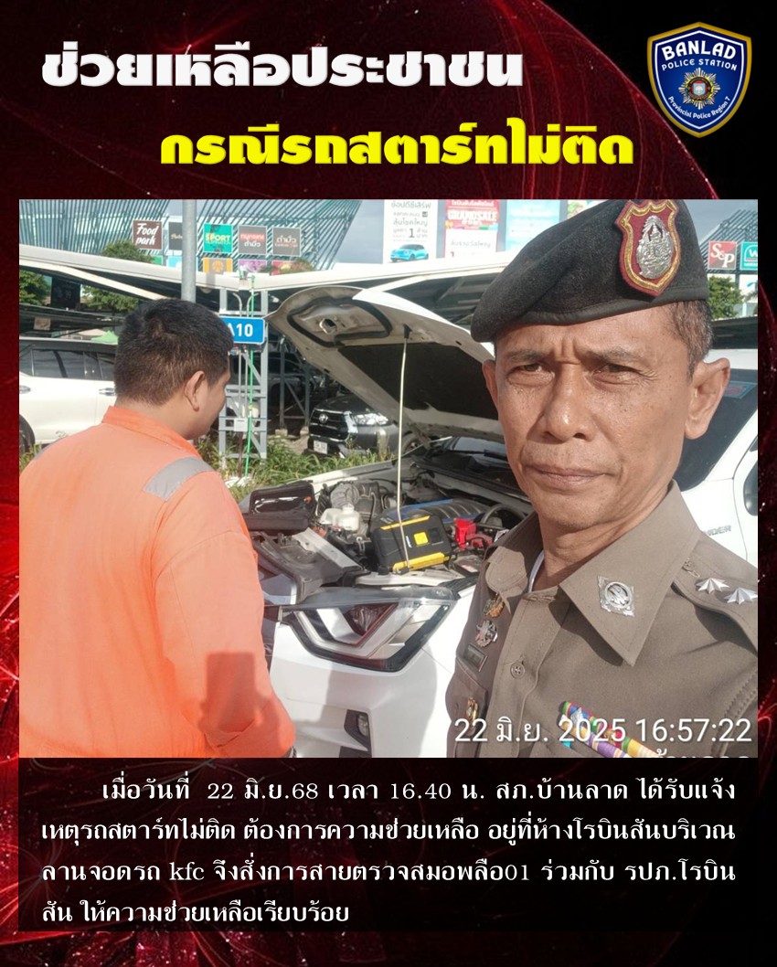 สายตรวจสมอพลือ ให้ความช่วยเหลือประชาชน กรณีรถสตาร์ทไม่ติด เมื่อวันที่ 23 มิ.ย.68 เวลา 15.25 น. 26 มิถุนายน 2568 โดย ณัฐวุฒิ เมืองขวัญใจ