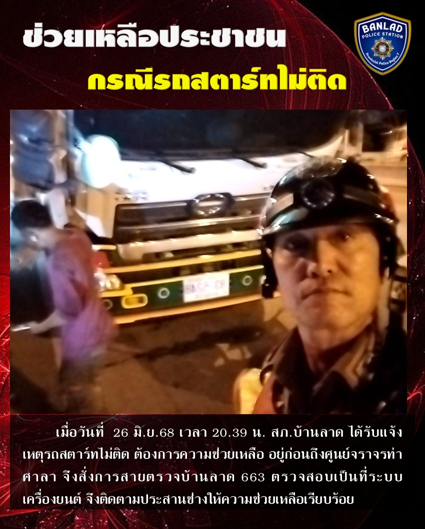 สายตรวจบ้านลาด 663 ให้การช่วยเหลือประชาชนกรณีรถสตาร์ทไม่ติด เมื่อวันที่ 26 มิ.ย.68 เวลา 20.39 น. 30 มิถุนายน 2568 โดย ณัฐวุฒิ เมืองขวัญใจ
