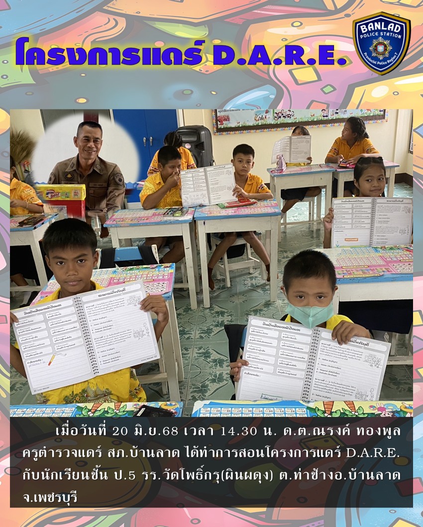 ครูแดร์ได้ทำการสอนโครงการแดร์ D.A.R.E. กับนักเรียน ชั้น ป.5 รร.วัดโพธิ์กรุ(ผินผดุง) เมื่อวันที่ 20 มิ.ย.68 เวลา 14.30 น. 26 มิถุนายน 2568 โดย ณัฐวุฒิ เมืองขวัญใจ