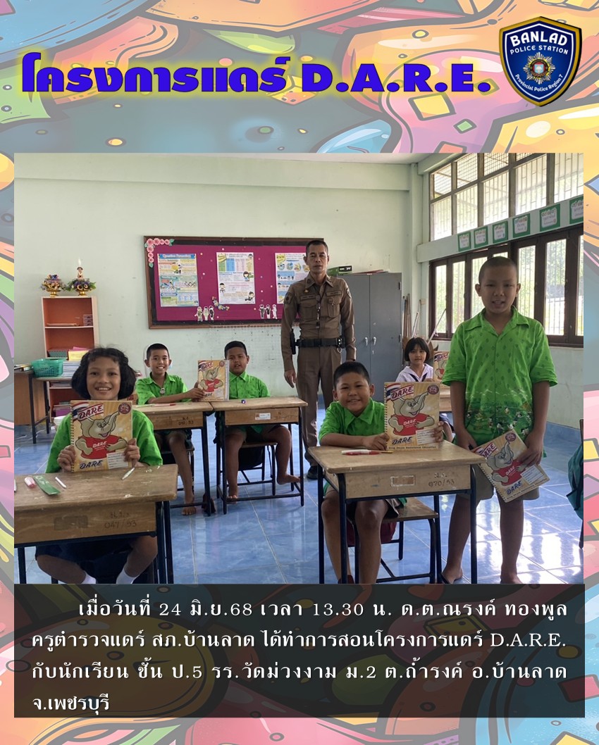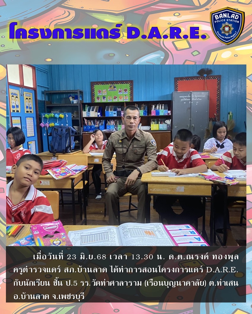 ครูแดร์ได้ทำการสอนโครงการแดร์ D.A.R.E. กับนักเรียน ชั้น ป.5 รร.วัดท่าศาลาราม เมื่อวันที่ 23 มิ.ย.68 เวลา 13.30 น. 26 มิถุนายน 2568 โดย ณัฐวุฒิ เมืองขวัญใจ