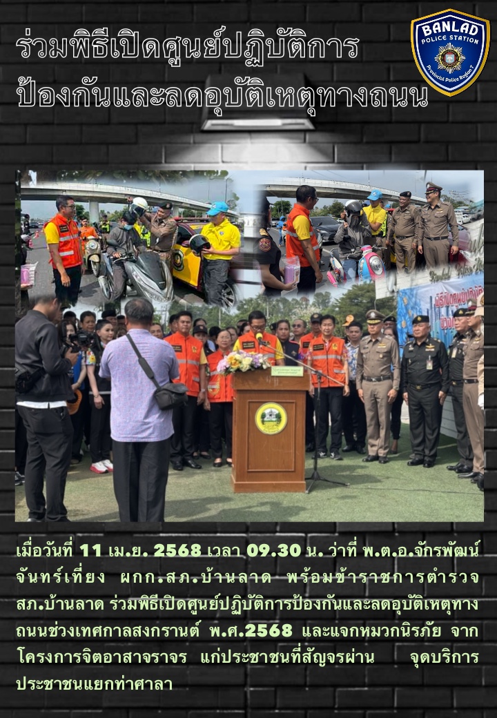 ร่วมพิธีเปิดศูนย์ปฏิบัติการป้องกันและลดอุบัติเหตุทางถนนช่วงเทศกาลสงกรานต์ พ.ศ.2568 และแจกหมวกนิรภัย จากโครงการจิตอาสาจราจร แก่ประชาชนที่สัญจรผ่าน เมื่อวันที่ 11 เม.ย. 2568 เวลา 09.30 น. 12 เมษายน 2568 โดย ณัฐวุฒิ เมืองขวัญใจ