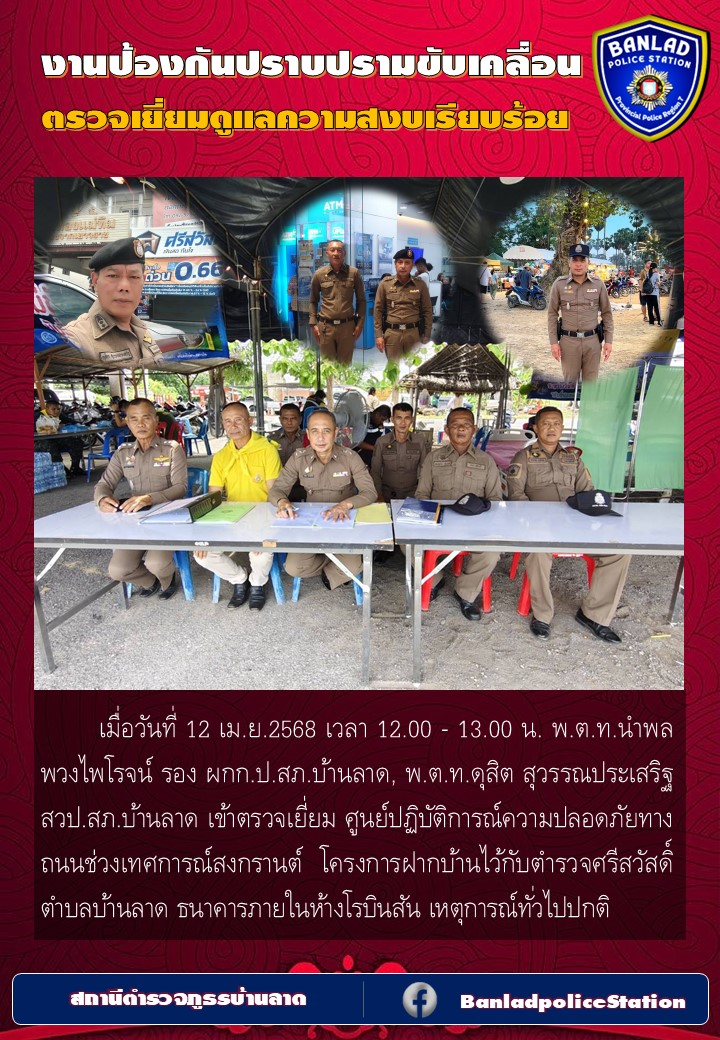 งานป้องกันปราบปรามขับเคลื่อน ตรวจเยี่ยมดูแลความสงบเรียบร้อย เมื่อวันที่ 12 เม.ย.2568 เวลา 12.00 น. 13 เมษายน 2568 โดย ณัฐวุฒิ เมืองขวัญใจ