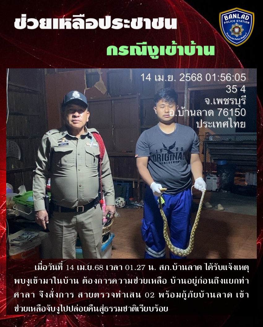 สายตรวจท่าเสน 02 พร้อมกู้ภัยบ้านลาด ให้การช่วยเหลือประชาชน กรณีงูเข้าบ้าน เมื่อวันที่ 14 เม.ย.68 เวลา 01.27 น. 16 เมษายน 2568 โดย ณัฐวุฒิ เมืองขวัญใจ