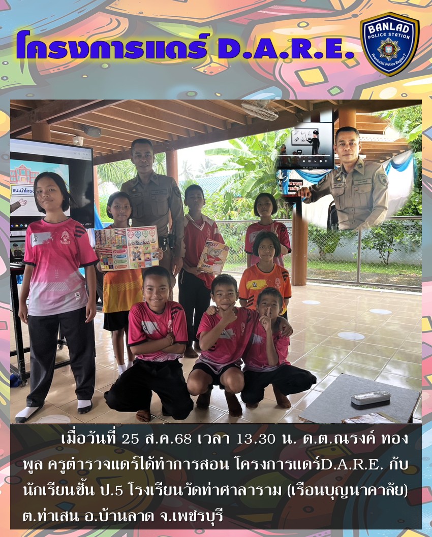 ด.ต.ณรงค์ ทองพูล ครูตำรวจแดร์ได้สอน โครงการแดร์D.A.R.E. กับนักเรียนชั้น ป.5 โรงเรียนวัดท่าศาลาราม เมื่อวันที่ 25 ส.ค.68 เวลา 13.30 น. 28 สิงหาคม 2568 โดย ณัฐวุฒิ เมืองขวัญใจ