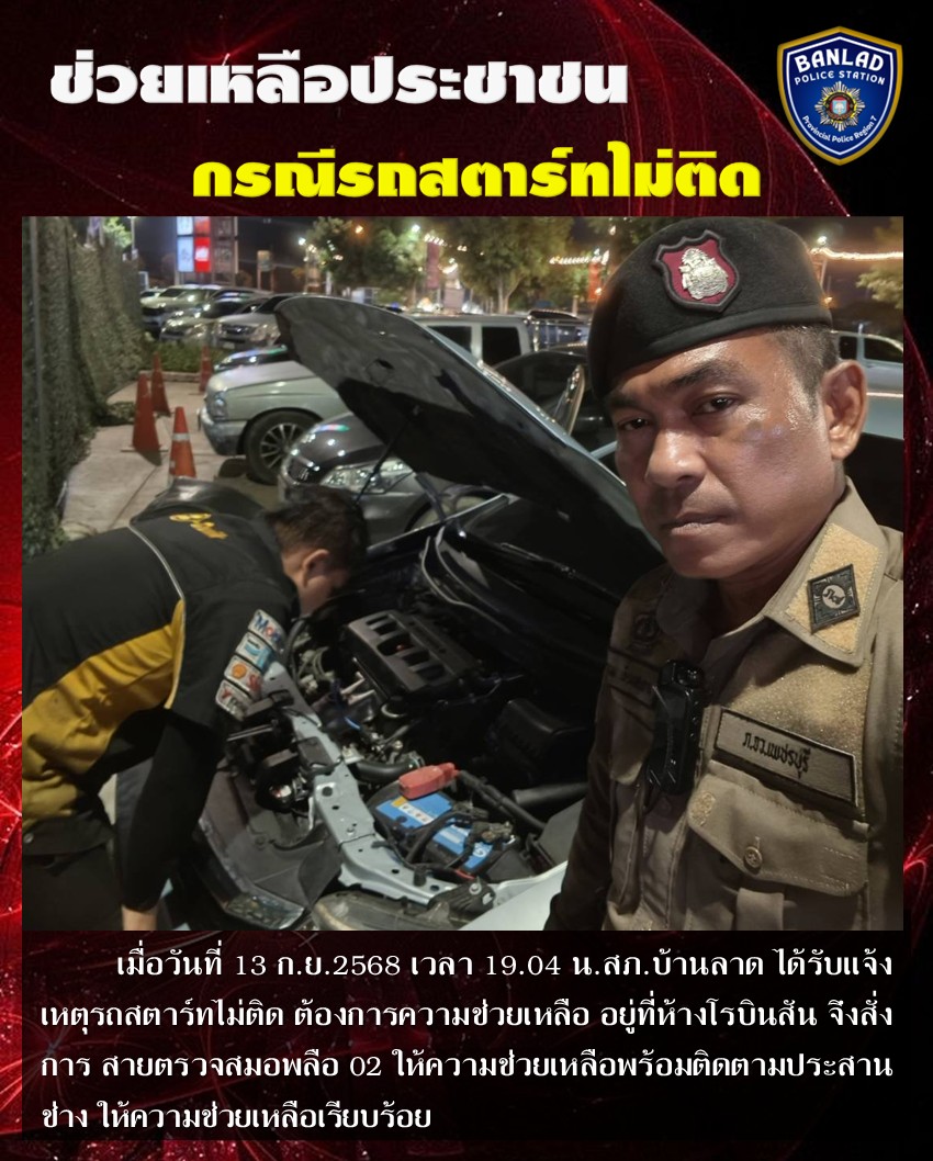 สายตรวจสมอพลือ 02 ให้ความช่วยเหลือประชาชน กรณีรถสตาร์ทไม่ติด เมื่อวันที่ 13 ก.ย.2568 เวลา 19.04 น. 16 กันยายน 2568 โดย ณัฐวุฒิ เมืองขวัญใจ